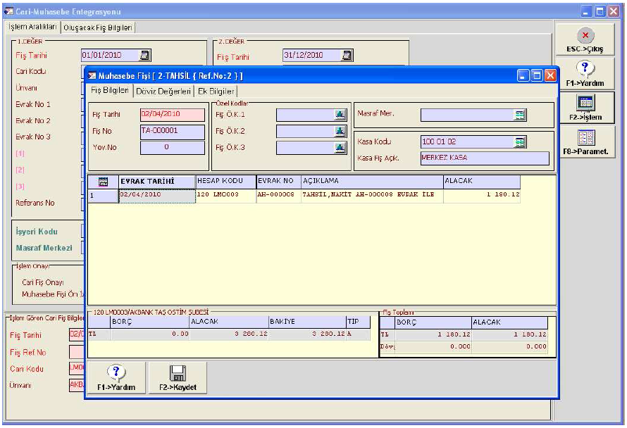 cari fişlerine ait muhasebe entegrasyonu yapılır.