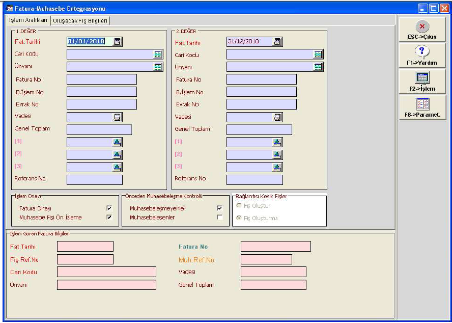 Fatura-Muhasebe Entegrasyonu formu iki ayrı sekmeden oluşmaktadır: